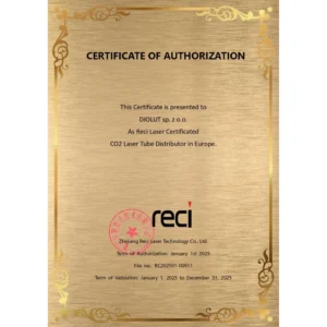 Certyfikat potwierdza, że DIOLUT sp. z o.o. (właściciel marki TopLaser) jest autoryzowanym dystrybutorem tub laserowych CO2 marki RECI w Europie w okresie ważności wskazanym na dokumencie.