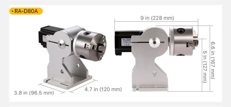 Głowica obrotowa pozwala rozszerzyć funkcjonalność znakowarki laserowej, umożliwiając precyzyjne grawerowanie elementów o kształcie cylindrycznym, takich jak rury, tuleje, długopisy czy inne detale obrotowe. Solidna konstrukcja oraz precyzyjny napęd zapewniają stabilną i powtarzalną pracę w warunkach seryjnej produkcji.